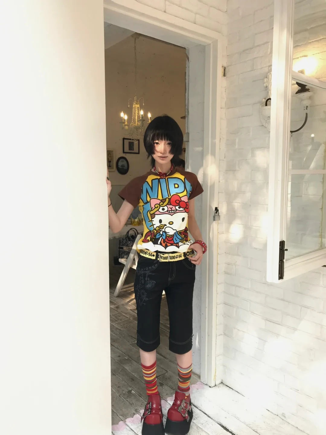 Turn heads this summer with this trendy Sanrio Hello Kitty Y2K-inspired short-sleeve t-shirt! Featuring bold cartoon prints and a stylish cropped cut, this tee blends kawaii vibes with high street gothic flair — perfect for fans of edgy and cute fashion.